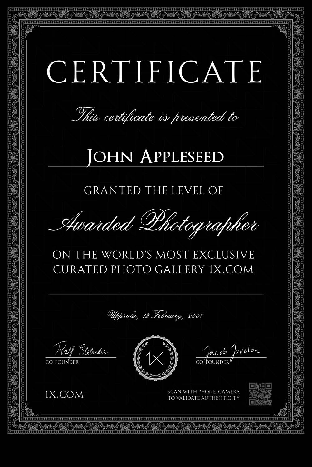 At certain points throughout your journey on 1x you will get official certificates that can be used to show people that you are a skilled photographer. They can be verified using a QR code to prove authenticity. Perfect for your CV.