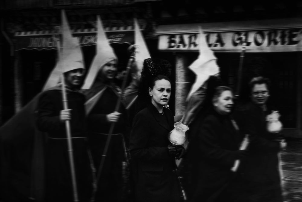 It is my first analogue photo where I was fully satisfied with the result. It is a scene related to Easter in Toro, a small Spanish town where this religious festival is deeply rooted. I went there to get a good story about the event. I arrived early and walked through the streets. I saw coming towards me a group of people dressed for the procession that would take place that morning. They were laughing and joking in contradiction to the seriousness of the religious event. I aimed and fired several times. This is the one I like the most because the young girl made eye contact with me. It departs somewhat from an urban landscape but street photography is also a natural part of me. It is not an artistic masterpiece nor does it have the best framing but as I said, when the story is good, it overrides technique.
