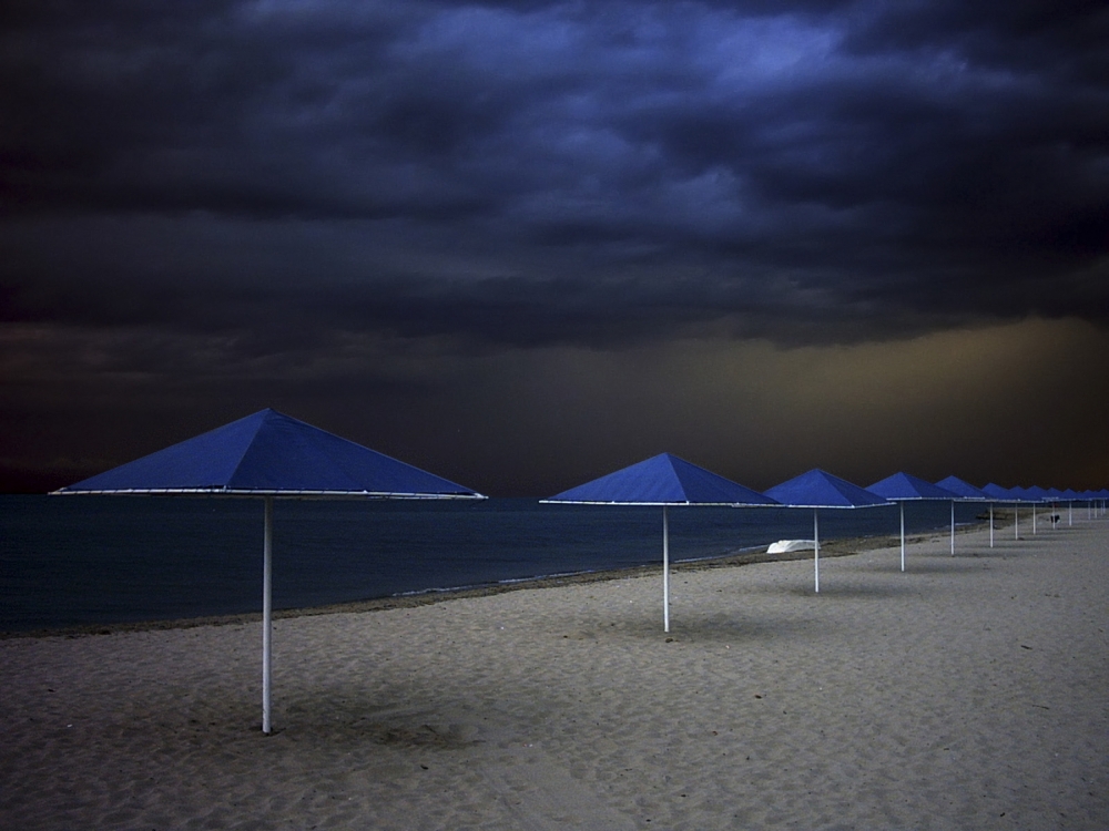 When I arrived at the beach, the color of the sky and the umbrellas got my attention. There was no one in sight, and the air had the sweet smell of rain and earth. It was obvious that it was raining in the distance on the open sea, and the wind was carrying the smell back to shore. The crashing sound of the waves served as the messenger of the fast-approaching storm. I had a simple camera with me, and I needed to find a good composition before it started raining.