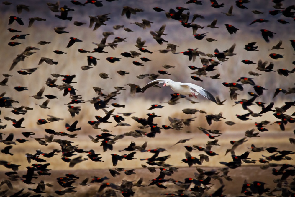 It was a chilly winter morning in New Mexico when I was photographing cranes and snow geese. The cranes had rested over a swamp area during the night. Light fog hovered over the water at dawn when the sun turned it into a steamy golden pond. I was immersed in the dreamy mood and asked myself - how do I enhance the dream? I envisioned an image in which birds fly over the water and they were blurry as if they were flying in a dream... My experience told me that the cranes would take off soon after the sunrise and they would take off in a direction that was against the wind. So I aimed the camera to the area in the predicted flight path of the cranes, set the manual focus at the distance I predicted, locked down the camera on the tripod, and used ISO200, F16, 1/6 second shutter speed. I have photographed cranes with slow shutter speed in many occasions. I knew that the cranes would appear blurry whilst still maintaining some detail at this speed. This was almost a typical technique I would use for landscape work, except I set the camera at a high-speed continuous shooting mode.