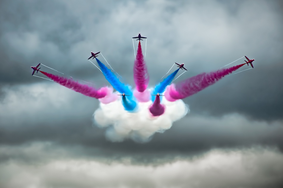 For capturing those split second parts of the routine like 2 jets crossing in opposite directions, don’t be afraid to use a continuous high-speed shutter release, panning one aircraft and starting the sequence using the ‘corner of the eye’ technique as the other approaches. But there’s still a lot of luck involved as even with 1/8s between frames, that’s a lot of aircraft movement at a closing speeds of 1000mph!