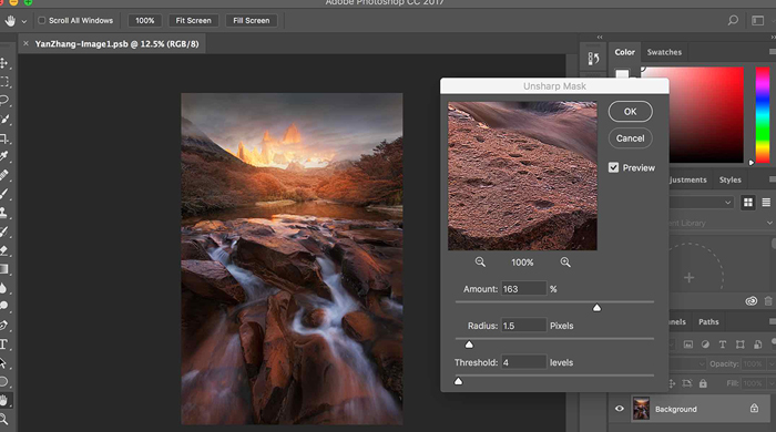 As a general rule, for a large print, you may set Amount around 160 – 180, Radius not more than 3, and keep Threshold 3 – 5. But remember always check the preview window in 100% to see the sharpen effect, as shown in the following picture.